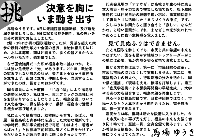 震災から14年。復興は新たな段階に入りました。今こそ市民の心に再び光を灯し、福島の未来を力強く切り拓く時です。至誠一貫、全身全霊で挑みます。どうか希望ある福島を、皆さまと