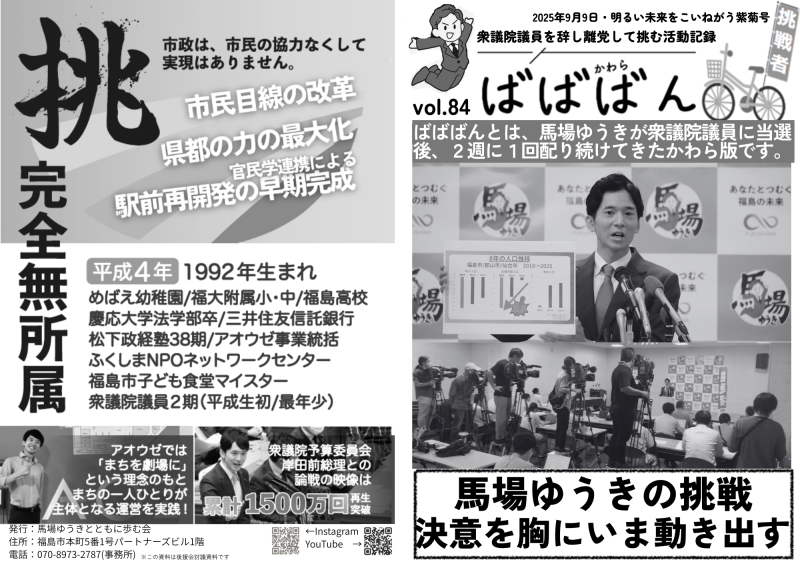 掲げる方向性は三つ。第一に「市民目線の改革」。市政は市民の協力なくして実現しません。第二に「県都福島の力の最大化」。行政都市の強みを活かし、国や県と連携して現場を支え、停滞を打破します。第三に「官民学連携による駅前再開発の早期完成」。大学や若者の力を融合させ、福島の顔を再生します。
